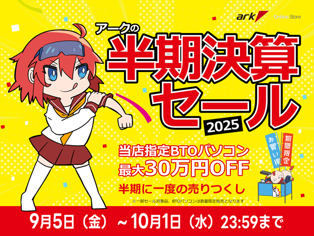 Published 2025年9月6日 at 620 × 465 in アーク 半期決算セール 2025を開催!春夏商品売り尽くし!見逃し厳禁アイテムを多数ご用意!アークハイブPCは最大300,000円OFF!!.