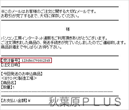 発送完了メールに記載の受注番号 記載場所