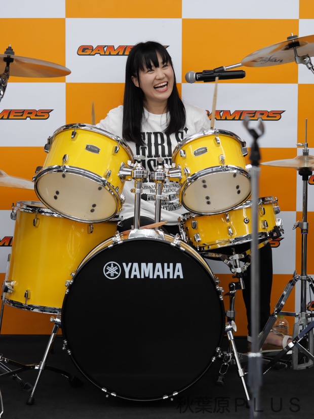 ドラム・内山つかささん(白瀬双葉役)。常に満面笑顔ながらパワフルさを増しているドラミングと、さく裂するおもしろトークは絶対注目![撮影:李徴さん]