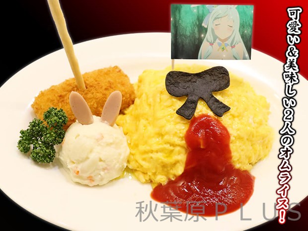 ユエをイメージしたオムライスには黒いリボンと血のようなトマトソースを添え、シアをイメージしたポテトサラダにはうさ耳を。カニクリームコロッケで出来たドリュッケンを添えて。
