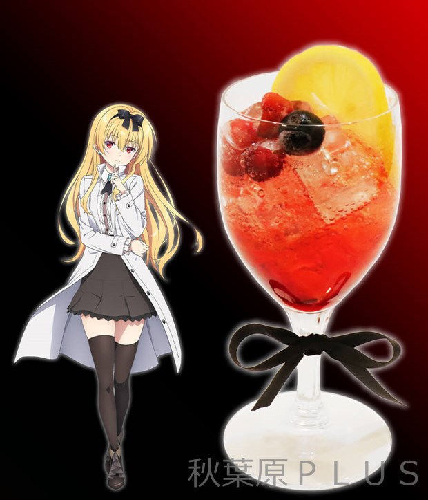 ユエをイメージした黄色と赤と黒リボンのドリンク。刺激的な炭酸にゼリーやミックスベリーが入って飲みごたえアリ。