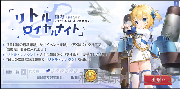 期間限定イベント「リトル ロイヤルナイト」も復刻開催中! メンテナンス後初回ログイン時、限定艦船「リトル・レナウン」が仮加入します。イベント期間中に3章以降の通常海域(ノーマルモードのみ)またはイベント海域をクリアすると、「友好度」を入手することができ、獲得した友好度の累計数に応じて、資金や教科書などを入手可能なミッションを達成することができる。最後のミッションを達成すると「リトル・レナウン」が正式加入する。この機会に迎えよう!