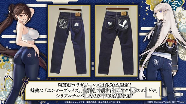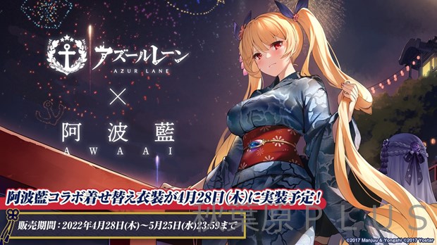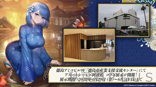 スマートフォン向けアプリ『アズールレーン』において、2022年4月28日(木)のメンテナンス後より、徳島の伝統的な藍染めである「阿波藍」とのコラボ着せ替え衣装の実装、さらに2022年4月29日(金)より、徳島県徳島市のアミコビル9Fの徳島市産業支援交流センターにて阿波藍コラボ展示を行うほか、藍染浴衣、ジーンズなどのコラボ商品を販売することを発表した。