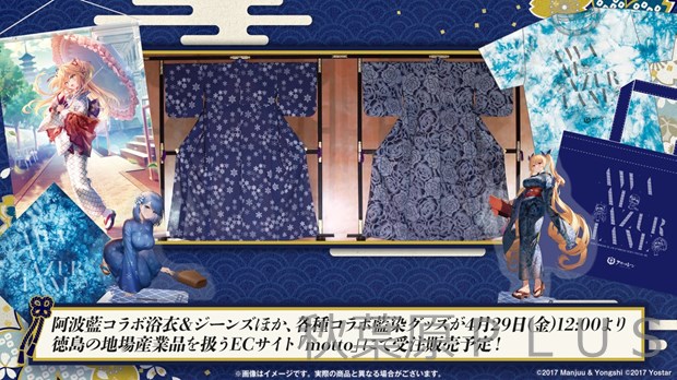 昨年(2021年)、「アズールレーン」と徳島の伝統的な藍染め「阿波藍」とのコラボレーションを発表した。本コラボでは、アズールレーンの人気キャラクター「ネルソン」、「チャパエフ」、「アドミラル・ヒッパー」をモチーフにした阿波藍コラボ浴衣と、「瑞鶴」、「エンタープライズ」をモチーフにした阿波藍コラボジーンズを制作し、アズールレーンの公式 YouTubeチャンネルにて制作の様子を密着したドキュメンタリー番組を公開。さらに2022年4月28日(木)のメンテナンス後より、ゲーム内でも実際に制作した藍染コラボ浴衣を纏った「ネルソン」、「チャパエフ」、「アドミラル・ヒッパー」のコラボ着せ替え衣装を実装予定だ。