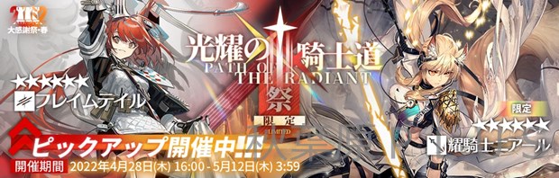 リミテッドスカウト・祭シリーズ「光耀の騎士道」にて、新限定オペレーターの「★6 耀騎士ニアール」や新オペレーターの「★6 フレイムテイル」など頼もしいオペレーターのスカウトが可能。