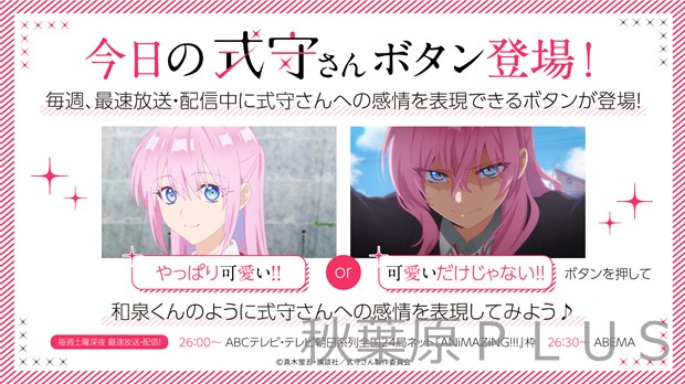 さらに、最新話視聴中、式守さんへの感情を表現できる「今日の式守さん✨ボタン」が毎週登場! そのときの感情に合わせて「今日の式守さんは【やっぱり可愛い!!】or【可愛いだけじゃない!!】」ボタンを押して、Twitterでシェアしてみよう! ボタンが押せるのは、最速放送・配信期間中の、毎週土曜26:00~27:00の間です! 和泉くんのように式守さんへの感情を表現して、一緒に最速放送・配信を盛り上げましょう♪
