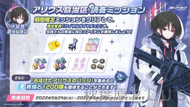 ガイドミッション「アリウス自治区調査ミッション」が開催中。様々なミッションをクリアすることで、生徒の育成アイテムや限定家具などの豪華報酬を入手可能。さらに「古ぼけたアリウスのバッジ」を集めることで、合計で青輝石1200個も獲得することができる。ぜひ挑戦してみよう!