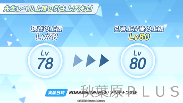 先生のレベル上限が78から80までに引き上がる。先生のレベル上限開放で生徒もさらに強くなりますので、ぜひこの機会に生徒と共に成長しよう!