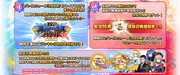 本イベントの参加特典やランキング報酬では、新アイテム「福袋召喚補助券」が獲得可能。「福袋召喚補助券」は、100枚集めると対象の期間限定★5(SSR)サーヴァントが1騎確定の10回召喚が行える「福袋召喚引換券」と交換可能なアイテムだ。「福袋召喚補助券」は、今後のイベントやキャンペーン等でも獲得可能。