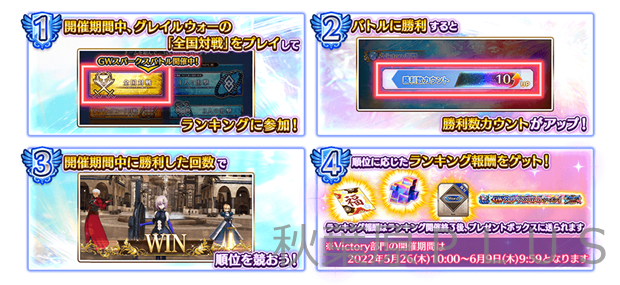 「Victory 部門」では、開催期間中にグレイルウォーの「全国対戦」でバトルに勝利すると「勝利数カウント」がアップし、その回数で順位を競い合う。
