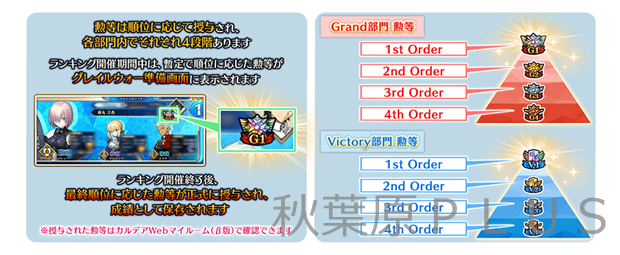 「勲等」は本イベントの順位に応じて授与される強さの証です。「Grand 部門」と「Victory 部門」のそれぞれに「1st Order」から「4th Order」の4段階がある。開催期間中は、暫定で順位に応じた「勲等」がグレイルウォー準備画面に表示され、開催終了後に、最終順位に応じた「勲等」が正式に授与され、シーズンごとに成績として保存される。