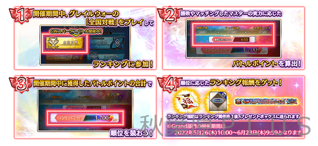 本イベントは、「Grand 部門」と「Victory 部門」の2つの部門があり、本イベント開催期間中にグレイルウォーの「全国対戦」に参加すると両部門に自動でエントリーされ、各部門で「バトルポイント」や「勝利数カウント」が記録される。