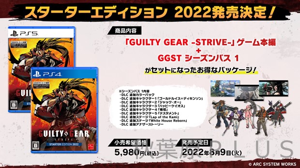 本編とシーズンパス1がセットのお買い得パッケージ『GUILTY GEAR -STRIVE- スターターエディション2022』が2022年8月9日に発売決定! 明日(2022年5月26日)より予約受付開始となる。ゲーム本編に加えてシーズンパス1のコンテンツが同梱され、お求めやすい価格となっている。パッケージには石渡太輔描きおろしの新規ビジュアルを掲載。これから本作を始めてみたい方にオススメのパッケージだ。