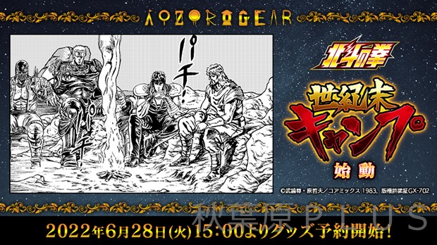 2022年6月28日にキャラクターのアウトドアグッズ専門ECサイト『AOZORAGEAR online SHOP』(アオゾラギア オンラインショップ)がオープン! オープンの目玉に「北斗の拳」の世紀末キャンプグッズを発売! 「北斗の拳」以外にも「ゆるキャン△」「初音ミク」「ゴジラ」のアウトドアグッズをラインナップする予定との事だ。詳細をみていこう。