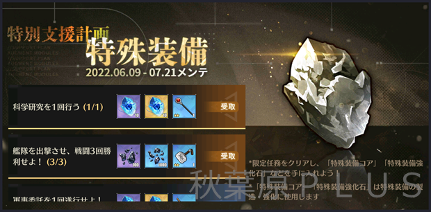 ※「特殊装備コア」とは、特殊装備を製造・突破する際に必要なアイテムです。「強化石」とは、特殊装備を強化する際に必要なアイテムです。