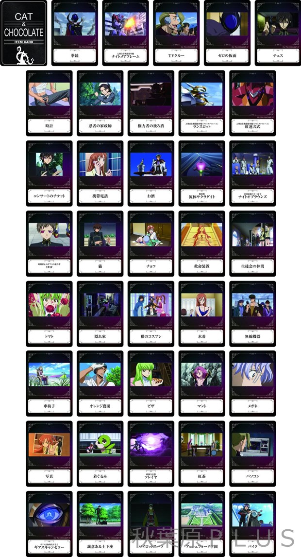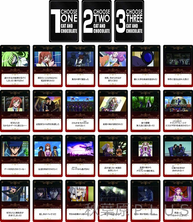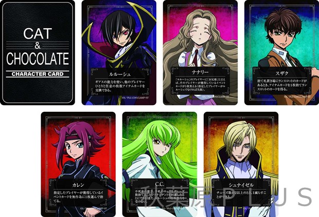 「『コードギアス 反逆のルルーシュ』×キャット&チョコレート」では、各プレイヤーがコードチームもしくはギアスチームの一員となり、作品中で実際に起こったアクシデントを、手札のアイテムカードとプレイヤーのアイデアを駆使して、どうやって回避するかを考える。プレイヤーは作品のことを思い出しつつ、『コードギアス 反逆のルルーシュ』の世界観を擬似体験できるゲームとなる。この商品の特徴となるエクストラモードでは、キャラクターごとが持つ特殊能力を使用して遊ぶことが出来る。「『コードギアス 反逆のルルーシュ』×キャット&チョコレート」は、amazon、全国のボードゲームSHOP他にて好評発売中!是非このカードゲームで、『コードギアス 反逆のルルーシュ』の世界に入り浸ってみよう!