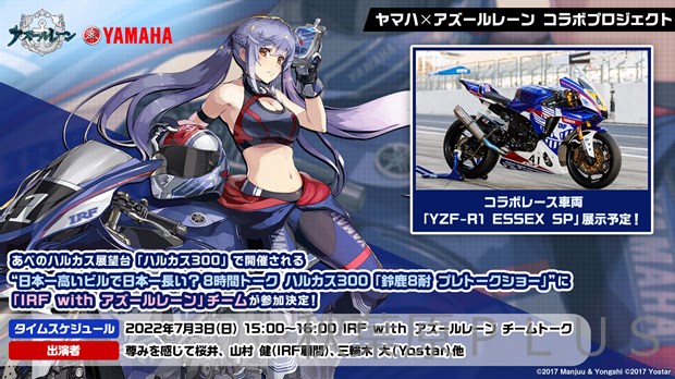 スマートフォン向けアプリ『アズールレーン』とヤマハ発動機株式会社とのコラボレーションプロジェクトの一環で、2022年7月3日(日)にあべのハルカスの展望台「ハルカス300」で開催される『ハルカス300「鈴鹿8耐 プレトークショー」』に「IRF with アズールレーン」チームが参加することを発表した。