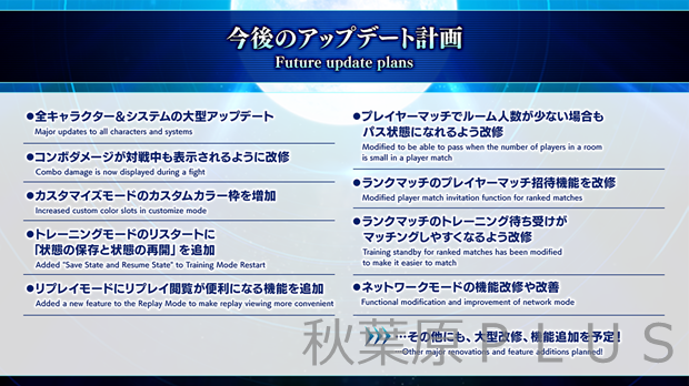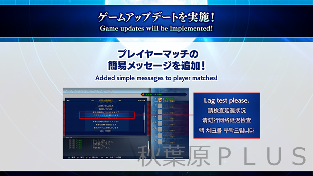 2022年6月29日(水)15:00※に、「CUSTOMIZE」のFREE WORD400種とPLATE2種、プレイヤーマッチの簡易メッセージを追加するゲームアップデートを実施した。PLATEは、“『MELTY BLOOD: TYPE LUMINA』Official Tournament”と、「プラットフォーム別公認(コミュニティ)大会応援期間」の開催を記念して追加する。本PLATEは、ゲーム内ポイント4000CPを消費することで獲得できる。FREE WORDやPLATEをお好みでカスタマイズしたり、プレイヤーマッチの簡易メッセージで、プレイヤーの皆さま同士のコミュニケーションを楽しんでほしい。
