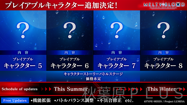 2D対戦格闘ゲーム『MELTY BLOOD: TYPE LUMINA』の、今後追加予定のプレイアブルキャラクターに関するロードマップを公開した。追加キャラクターは今夏に2体、今冬に2体、合計4体を追加予定との事。そのほか、特定条件を満たす公認大会の参加者に「大会限定カラーパレット(黒×金)」をプレゼントする「プラットフォーム別公認(コミュニティ)大会応援期間」の受付開始や、公式大会の第3回に関する情報などを公開した。