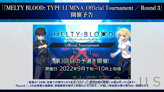 Project LUMINA が主催する『MELTY BLOOD: TYPE LUMINA』の公式大会“『MELTY BLOOD: TYPE LUMINA』Official Tournament”の第3回目の予選大会は、2022年9月下旬~10月上旬に開催予定! 大会へのエントリー受付の開始日は、後日改めて、受付開始前に本作の公式Twitterでお知らせいたします。先着順のエントリーとなるため、参加を検討されている方は、受付が開始されましたら、お早目にエントリーしよう。大会の詳細は、後日改めて通知する。“『MELTY BLOOD: TYPE LUMINA』Official Tournament”は、全4回の予選大会開催を予定しており、各予選大会の上位2名が進出する決勝大会(Final Round)は、プレイヤーの頂点を決める戦いとなる。