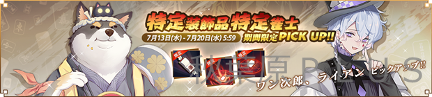2022年7月13日(水)メンテナンス後から7月20日(水)5:59まで、雀士などが入手できる限定祈願『満開の道』にて雀士「森川 綾子(CV:丹下 桜)」と「藤本 キララ(CV:竹達 彩奈)」が、限定祈願『深緑の道』にて雀士「ワン次郎(CV:小野 友樹)」と「ライアン(CV:下野 紘)」が期間限定ピックアップされる。