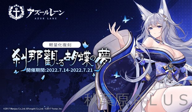 スマートフォン向けアプリ『アズールレーン』において、2022年7月14日(木)のメンテナンス後より、期間限定イベント「刹那觀る胡蝶の夢」の軽量化復刻が開催されるほか、特別計画艦の第5期が実装された。