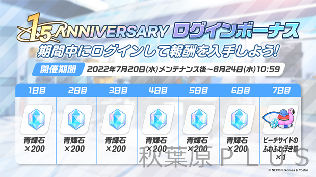 期間中、最大7日ログインすると青輝石やホシノ(水着)の家具モーション付き家具「ビーチサイドのふわふわ浮き輪」を入手できる。ぜひ毎日ログインして、豪華報酬を全部受け取ろう!