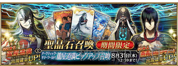 2022年8月10日(水)21:00から8月31日(水)12:59までの22日間、期間限定「アークティック・サマーワールド! 蘆屋道満ピックアップ召喚」を開催。本召喚では、期間限定サーヴァント「★5(SSR)蘆屋道満」と、「★4(SR)燕青(新宿のアサシン)」「★3(R)アスクレピオス」と、期間限定概念礼装「★5(SSR)インフィニティ・ブルー」「★4(SR)釣り人来たる」「★3(R)ハロー!アークティック」をピックアップする。期間限定概念礼装の「★5(SSR)インフィニティ・ブルー」「★4(SR)釣り人来たる」「★3(R)ハロー!アークティック」を装備することで、本イベントにおける「イベントアイテム」のドロップ獲得数がアップする。
