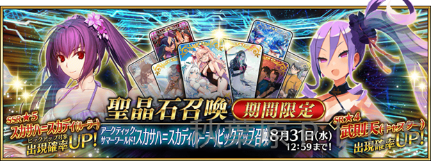 2022年8月17日(水)18:00から8月31日(水)12:59までの15日間、期間限定「アークティック・サマーワールド! スカサハ=スカディ(ルーラー)ピックアップ召喚」を開催予定。本召喚では、新登場の期間限定サーヴァント「★5(SSR)スカサハ=スカディ(ルーラー)」「★4(SR)武則天(キャスター)」と、期間限定概念礼装「★5(SSR)ツイン・テイル」「★5(SSR)インフィニティ・ブルー」「★4(SR)クルージング・デート」「★4(SR)釣り人来たる」「★3(R)キョンシー・アタック」「★3(R)ハロー!アークティック」をピックアップする。期間限定概念礼装の「★5(SSR)ツイン・テイル」「★5(SSR)インフィニティ・ブルー」「★4(SR)クルージング・デート」「★4(SR)釣り人来たる」「★3(R)キョンシー・アタック」「★3(R)ハロー!アークティック」を装備することで、本イベントにおける「イベントアイテム」のドロップ獲得数がアップする。