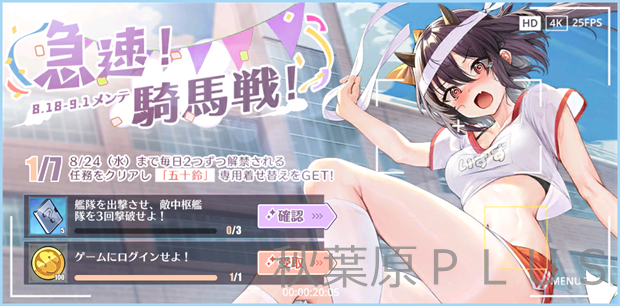 2022年8月18日~8月24日までの期間、毎日開放される限定任務をクリアして、五十鈴の限定着せ替え「駿馬?と共にいざ!」と報酬アイテムを入手しよう!