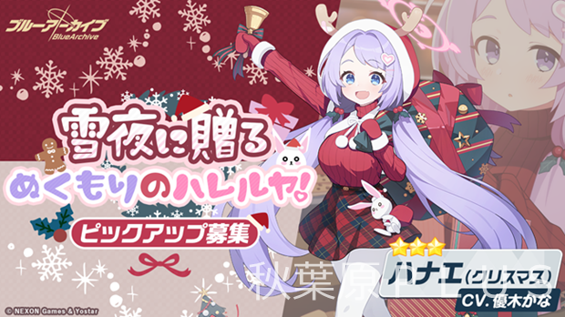 アプリゲーム『ブルーアーカイブ -Blue Archive-』(開発:NEXON Games社)において、2022年12月14日(水)のメンテナンス後より、期間限定イベント「聖堂のメリークリスマス~救護騎士団の贈り物~」の開催や新生徒「ハナエ(クリスマス)」、「セリナ(クリスマス)」のピックアップ募集を開催した。