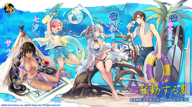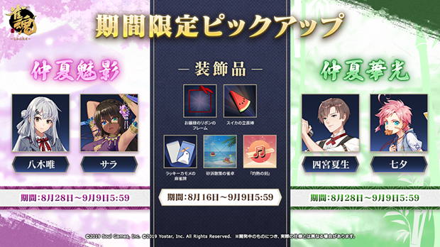2023年8月28日(月)6時からの限定祈願『仲夏魅影』では、「八木 唯」(CV:小清水 亜美)、「サラ」(CV:M・A・O)を、『仲夏華光』では四宮 夏生(CV:福山 潤)と「七夕」(CV:植田 佳奈)をピックアップする。