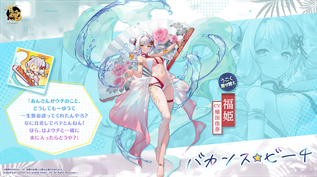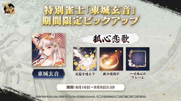 限定祈願『狐心恋歌』、『仲夏魅影』、『仲夏華光』を開催中。各限定祈願では、特別雀士の「東城 玄音」(CV:ゆきのさつき)、新たな着せ替えが登場する「福姫」(CV:植田 佳奈)、「藤田 佳奈」(CV:内田 真礼)、「ワン次郎」(CV:小野 友樹)、「石原 碓海」(CV:柿原 徹也)の獲得チャンスです。『仲夏魅影』と『仲夏魅影』は期間によってピックアップ対象が変化する。