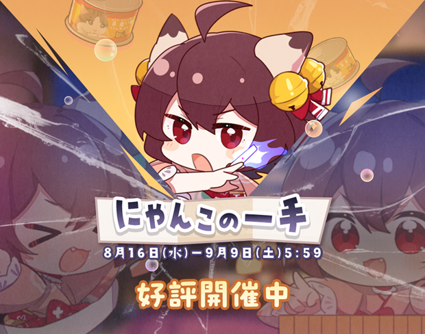 イベント「にゃんこの一手」は、伝説の「にゃんこの一手」目指して猛暑の中行う夏の麻雀大会。イベントクエストを達成することで「ねこ缶」を入手でき、報酬条件の達成で限定装飾品やイラスト、祈願の巻物を含む様々な豪華報酬が入手できる。詳細は以下の通り。