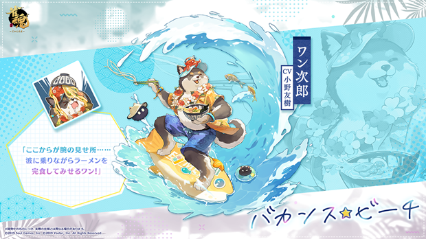 2023年8月16日(水)メンテナンス後からの限定祈願『仲夏魅影』では、「福姫」(CV:植田 佳奈)、「藤田 佳奈」(CV:内田 真礼)を、『仲夏華光』では、「ワン次郎」(CV:小野 友樹)、「石原 碓海」(CV:柿原 徹也)をピックアップする。