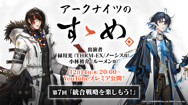 アプリゲーム『アークナイツ – 明日方舟 -』(以下、アークナイ ツ)の番組「アークナイツのすゝめ」第7回を2023年12月14日(木) 20:00よりYoutube にてプレミア公開する。番組では声優の緑川光さん(THRM-EX/ノーシス役)と小林裕介さん (ルーメン役)が登場する。