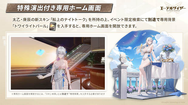 ■太乙・庚辰の新スキン「船上のナイトトーク」をホーム画面に設定の上、当該専用背景を適用すると下記の新規要素を楽しめる。