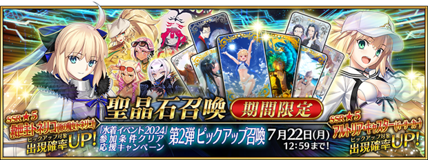 ■期間限定『「水着イベント 2024」参加条件クリア応援キャンペーン 第2弾ピックアップ召喚』:https://news.fate-go.jp/2024/2024summer_participation_cp2_pu/