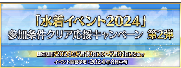 ■期間限定『「水着イベント 2024」参加条件クリア応援キャンペーン 第2弾』開催:https://news.fate-go.jp/2024/2024summer_participation_cp2/