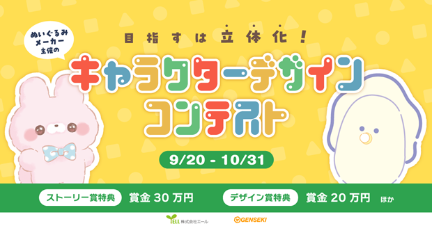 かわいくて心がほっこりするぬいぐるみやカプセルトイなどでおなじみの株式会社エールとのコンテストを『GENSEKI』にて開催! 犬・猫をモチーフにした、見た人が笑顔になれるようなキャラクターデザインを募集する。あなたの生み出したキャラクターがグッズとして立体化されるかも……!? ぜひ、オリジナリティあふれる魅力的なキャラクターデザインを応募しよう!