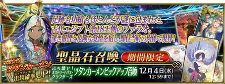 2024年11月13日(水)20:00から12月4日(水)12:59まで、期間限定「ぶち壊せ! ミステリーハウス・クラフターズ ツタンカーメンピックアップ召喚」(以下、本召喚)を開催する。本召喚では、新登場の期間限定サーヴァント「★5(SSR)ツタンカーメン」と、期間限定概念礼装「★5(SSR)星月巡り」「★4(SR)オアシス・ナイト」「★3(R)西部の破戒僧」をピックアップ。期間限定概念礼装「★5(SSR)星月巡り」「★4(SR)オアシス・ナイト」「★3(R)西部の破戒僧」は装備することで、本イベントにおける「イベントアイテム」のドロップ獲得数がアップする。
