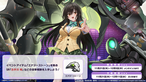 イベント海域攻略や任務達成で「エナジーストーン」を集めて、SSR軽巡洋艦「モモ・ベリア・デビルーク」やSR空母「古手川 唯」など豪華報酬を手に入れよう!