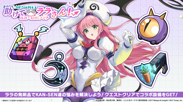 イベント海域や第3章以降の通常海域を達成することで入手できるイベントポイントを集めることで挑戦可能な特別クエスト「助けて、ララさん!」では、発明品を開発しKAN-SENたちの悩みを解決することで、コラボ設備を入手することができる。