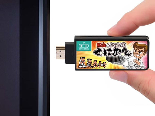 USBメモリの形状に似たゲーム内蔵スティックをテレビのHDMIポートに挿して使用するゲーム機が登場! 80-90年代の「くにおくん」シリーズ5タイトルがこれ1台で完全復活!裏技を集めた「秘伝の書」のおまけつき!