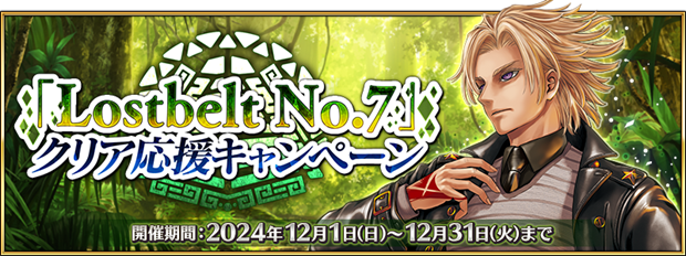 2024年12月1日(日)18:00から12月16日(月)12:59までの16日間、『「Lostbelt No.7」クリア応援キャンペーンピックアップ召喚』(以下、本ピックアップ召喚)を開催する。本ピックアップ召喚では、「Lostbelt No.7」に関連するサーヴァントの中から期間限定サーヴァント「★5(SSR)テスカトリポカ」「★5(SSR)ククルカン」を含む7騎のサーヴァントをピックアップする5種類の召喚を開催する。また、第2部 第7章「Lostbelt No.7 黄金樹海紀行 ナウイ・ミクトラン 惑星を統べるもの」をクリア済みの場合は、ストーリー限定の概念礼装から「★4(SR)あの遠い夜の日に」をピックアップする。