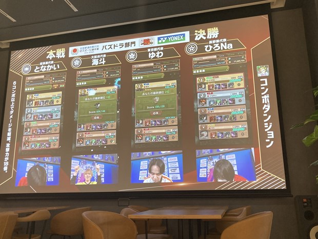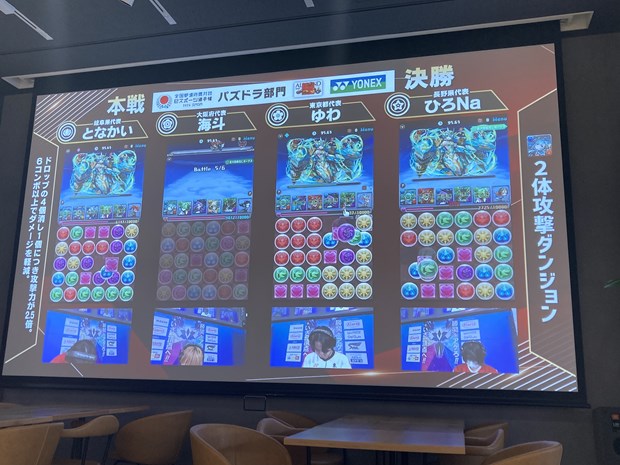 今回は決勝戦にはプロ選手が4名進出したという事で、激しい戦いが予測される。3本勝負の合計スコアで順位をとるという事でダンジョンの選択(運?)にもかなり影響される試合となっているようだ。最初のダンジョンは超コンボダンジョンとなるった。コンボ数が少ないと倒したいときに倒せない状況が起きるという事で、選択にかなりの時間がかかっているようだ。岐阜代表のとなかい選手、大阪府代表の海斗選手、東京都代表ゆわ選手、長野県代表ひろNa選手での戦いとなる。最初はひろNa選手がきれいに消して行く様子が見えたが、その間に海斗選手が一歩先にボス戦へ突入している。
