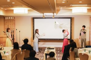 坂田さん&矢野さんが高砂に着席したところで来場者たちのテーブルに紅茶が配られ、稗田さんの音頭で乾杯を行いました。その後、キャスト陣がお色直しに入られるとの体で、その間に第1話&第2話の先行上映が実施。