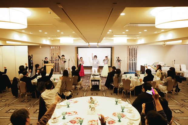 続いて牧師のジョナサンさんが坂田さん&矢野さんに「健やかなるときも、病める時も」とお馴染みの誓いの言葉を求めたものの、本当に結婚するわけではないためこれは拒否。ジョナサンさんの「オーマイゴッド」の呟きが聞こえると会場からようやく笑いが漏れ、その後「『クラ婚』を命ある限り愛する」との誓いをおふたりに立てていただきました。