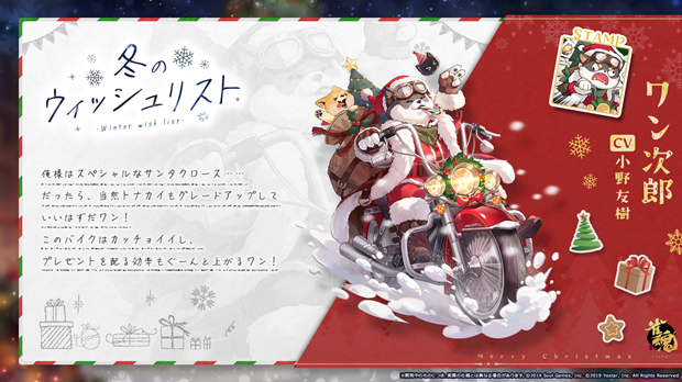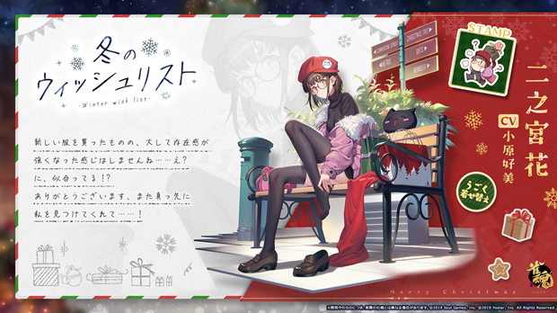 2024年12月19日(木)メンテナンス後より、期間限定着せ替え「冬のウィッシュリスト」、「円窓迎春」を販売する。祈願でピックアップ対象の「二之宮 花」(CV: 小原 好美)、「ワン次郎」(CV: 小野 友樹)、「白石 奈々」(CV: M・A・O)、「雛桃」(CV: 伊瀬 茉莉也)、「如月 彩音」(CV: 上坂 すみれ)、「七海 礼奈」(CV: 堀江 由衣)、「如月 彩音」(CV: 上坂 すみれ)、「四宮 冬実」(CV: 大西 沙織)、「斎藤 治」(CV: 安元 洋貴)、「如月 蓮」(CV: 前野 智昭)、「ゆず」(CV: 長縄 まりあ)が手に入るようだ。