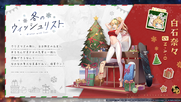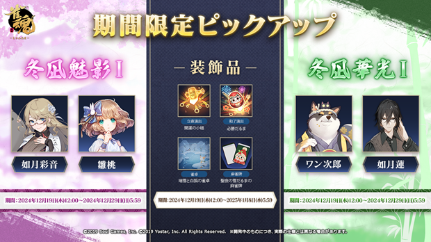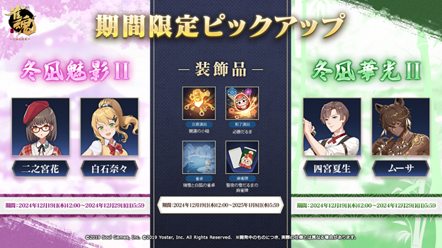 対戦型麻雀ゲーム『雀魂(じゃんたま)』において、2024年12月19日(木)メンテナンス後より、期間限定イベント「ウィンターワンダーランド」の開催を公開した。さらに、新雀士の元宵(ユエンシャオ)、非名(フェイミン)が登場する。